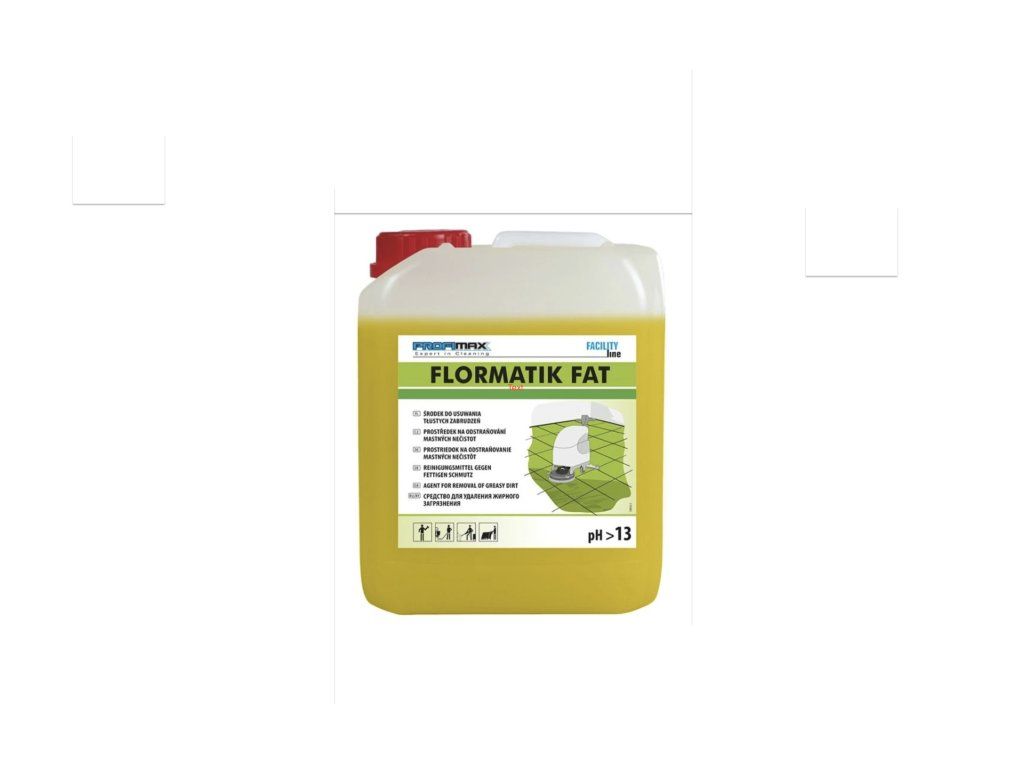 Může být také použit na praní pracovních oděvů a extrakční čištění koberců. Rychle a účinně odstraňuje mastné nečistoty, oleje, maziva a stopy po pneumatikách vysokozdvižných vozíků. FLORMATIK FAT AROMA je možné použít pro ruční a strojové čištění a při použití vysokotlakých strojů.