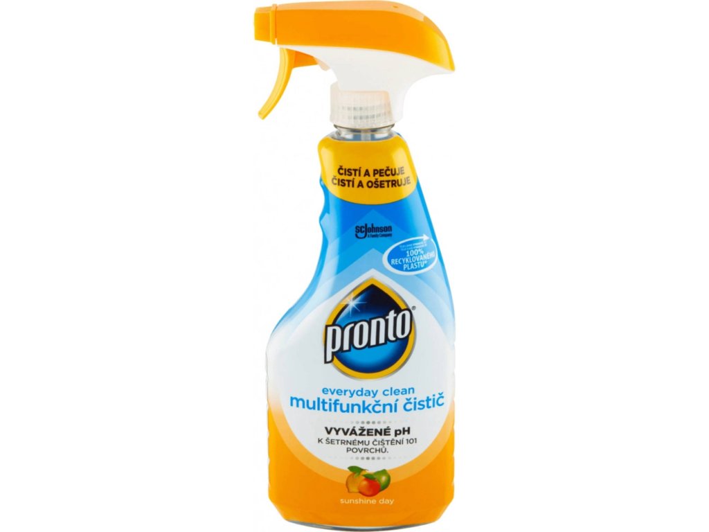 Vyvážené pH pro zdůraznění krásy vašeho domova. Pronto everyday clean multifunkční čistič je určený k odstraňování nečistot, ale dostatečně jemný pro každodenní použití. Složení výrobku šetrně odstraňuje nečistoty bez poškození povrchů nebo zanechání šmouh. Vyrobeno bez silikonu. Nepoužívejte na materiály bez povrchové úpravy: dřevo, mramor či žulu.POUŽITÍ:Otočte trysku do pozice ON. Nastříkejte. Setřete. Lehce nastříkejte přípravek na povrch a setřete jemným hadříkem nebo papírovou utěrkou. Není nutné oplachování. V případě použití na elektronická zařízení, nastříkejte na hadřík a postupujte dle pokynů výrobce. Doporučuje se otestovat účinek přípravku na malém skrytém místě. Elektrická zařízení nejprve odpojte.SLOŽENÍ:viz Ingredients na produktu.UPOZORNĚNÍ:Může vyvolat alergickou kožní reakci. Je-li nutná lékařská pomoc, mějte po ruce obal nebo štítek výrobkU. Uchovávejte mimo dosah dětí. Při styku s kůží: Omyjte velkým množstvím vody a mýdla. Při zasažení očí: Několik minut opatrně vyplachujte vodou. Vyjměte kontaktní čočky, jsou-li nasazeny a pokud je lze vyjmout snadno. Pokračujte ve vyplachování. Odstraňte obsah / obal v rámci tříděného odpadu v souladu se zákonem o odpadech. Používejte ochranné rukavice. Používejte pouze v dobře větraných prostorách.ŽIVOTNÍ PROSTŘEDÍ:Zcela prázdný a důkladně čistý plastový obal lze recyklovat. Třídění odpadu má smysl. Chraňte životní prostředí. Správným dávkováním šetříte peněženku i životní prostředí.